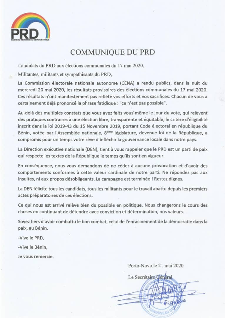 Se montrant respectueux des textes et autres lois de la république, le Parti du maître Adrien Houngbédji prend acte de son échec notamment liée au critère des 10% au plan national voté par la 8è législature peut-on lire dans le communiqué. La direction exécutif nationale qui félicite et encourage les militants pour le travail abattu invite par la même occasion à ne pas céder à la provocation et aux insultes.