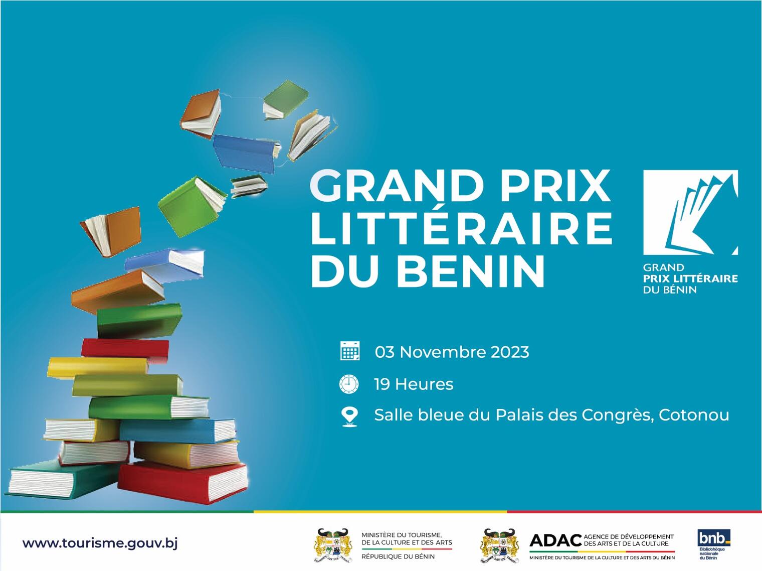 La cérémonie solennelle de remise de prix aux lauréats de l’édition 2023 du plus grand concours de littérature au niveau national dénommé « Grand Prix Littéraire du Bénin », se tiendra le vendredi 03 novembre 2023, à partir de 19 heures, dans la salle Bleue du Palais des Congrès de Cotonou.
